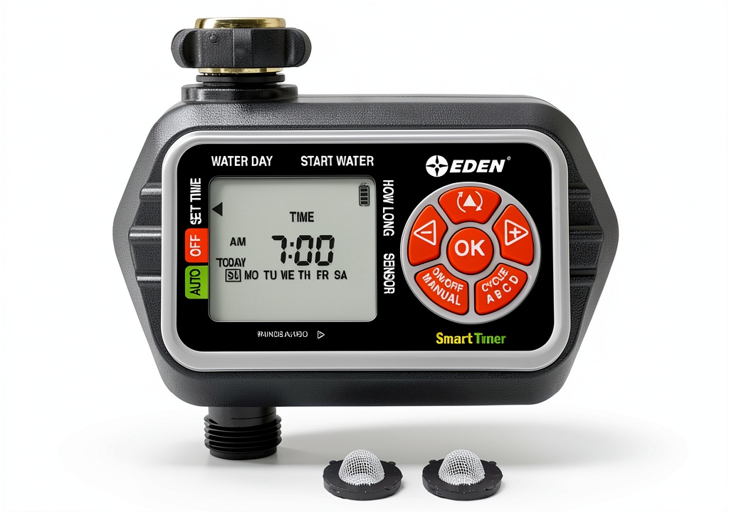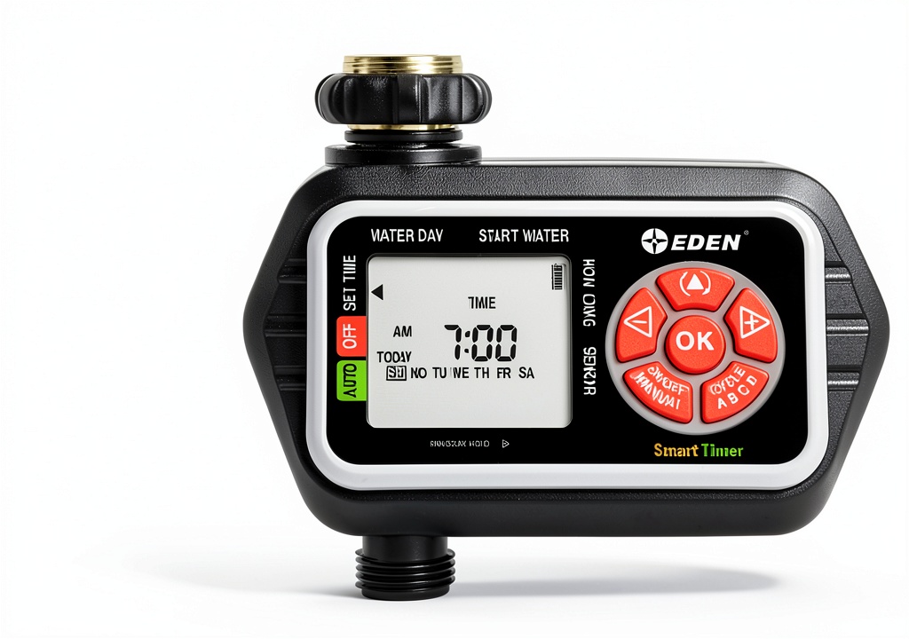 The Eden Water Timer simplifies lawn and garden care with automatic irrigation and customizable schedules. Its easy-to-use design includes a large LCD display and manual watering options, ensuring efficient water use. Built from durable brass, metal, and plastic, it’s ideal for homeowners seeking reliable, hassle-free watering solutions.