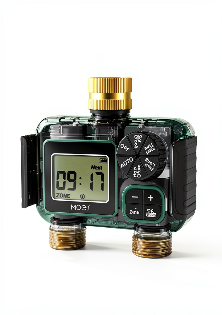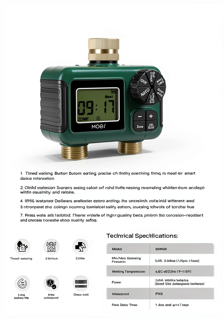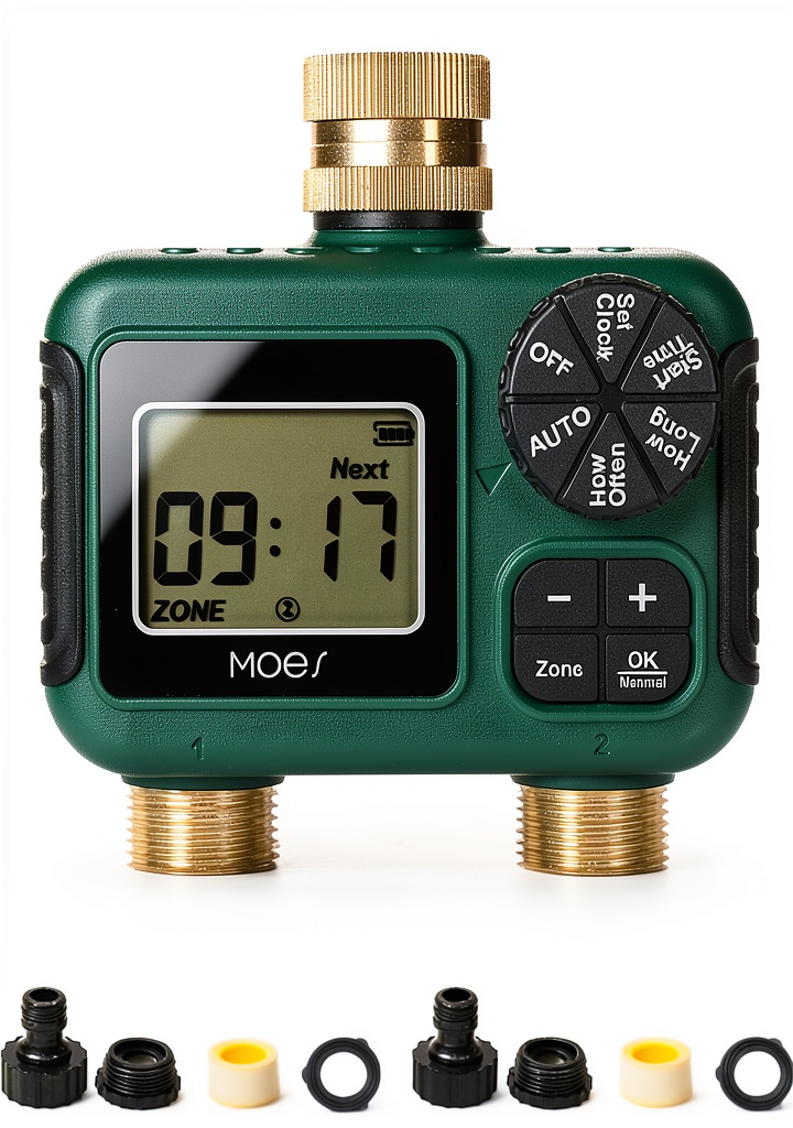 The MOES dual-zone watering timer is engineered for precise and efficient garden irrigation, featuring two independent programmable zones that allow customized watering times, frequencies, and durations. Constructed with durable brass inlets and outlets, along with polycarbonate components, it ensures superior leak resistance and corrosion protection. This timer measures 1 inch in diameter, width, and height, weighs 3.52 ounces, and includes four settings for versatile use. It is manufactured by WENZHOU NOVA NEW ENERGY CO., LTD, with model number SGW06, and is designed to meet the demands of residential and light commercial watering systems.