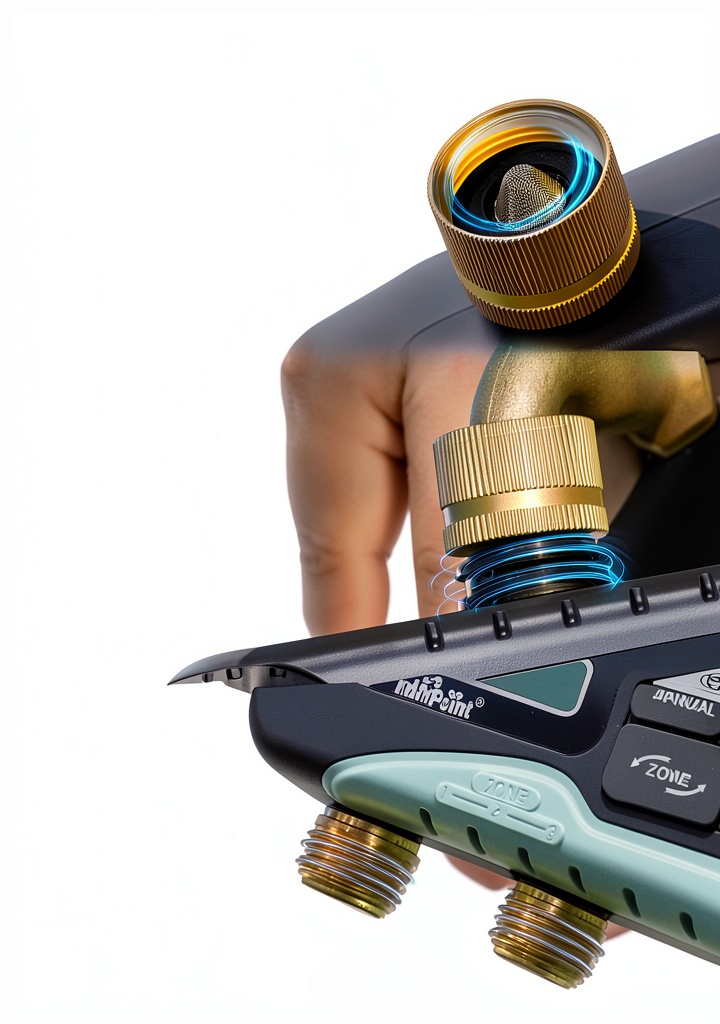 It features a metal inlet, coil valve, and reinforced connectors, along with a UV-resistant ABS shell, ensuring long-term reliability in outdoor conditions.